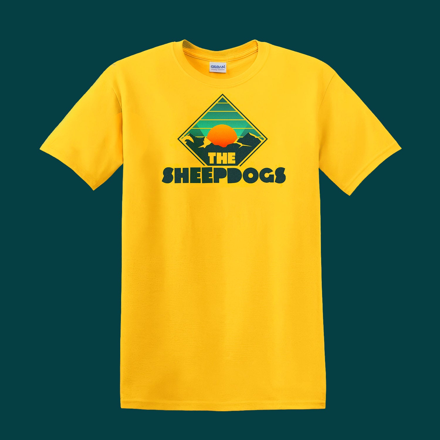 "The Sheepdogs" Sunset T-Shirt on yellow shirt.